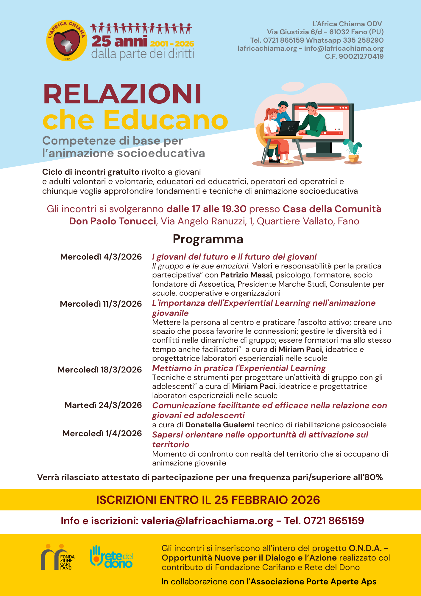 “RELAZIONI CHE EDUCANO – Competenze di base per l’animazione socioeducativa”, un percorso formativo pensato per volontari e volontarie, educatori ed educatrici, operatori e operatrici del sociale e per tutte le persone interessate ad approfondire strumenti concreti per l’animazione giovanile.