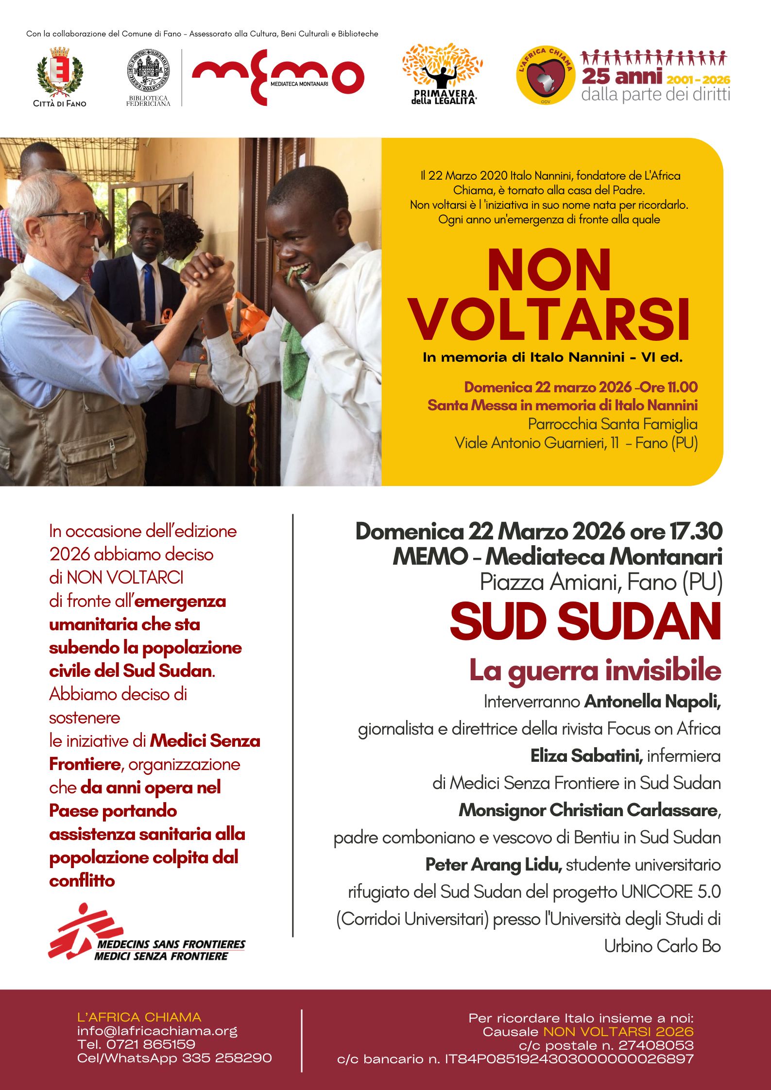 Domenica 22 marzo 2026 alle ore 17.30, presso la Sala Ipogea della Mediateca Montanari (Memo) di Fano, torna l’appuntamento con “Non voltarsi”, l’iniziativa promossa da L’Africa Chiama in memoria di Italo Nannini, presidente fondatore dell’associazione, scomparso il 22 marzo 2020.