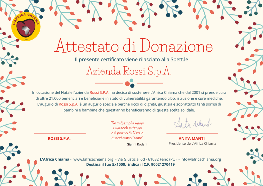 Scegli di sostenere un’azione specifica de L’Africa Chiama e ricevi l’attestato di Donazione che conferma l’impegno dell’Azienda al fianco dei nostri beneficiari e beneficiarie. Potrai poi condividere l’attestato coi tuoi contatti.
